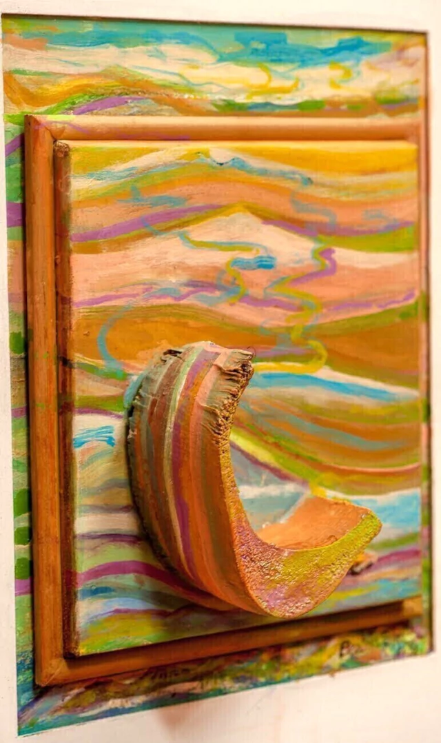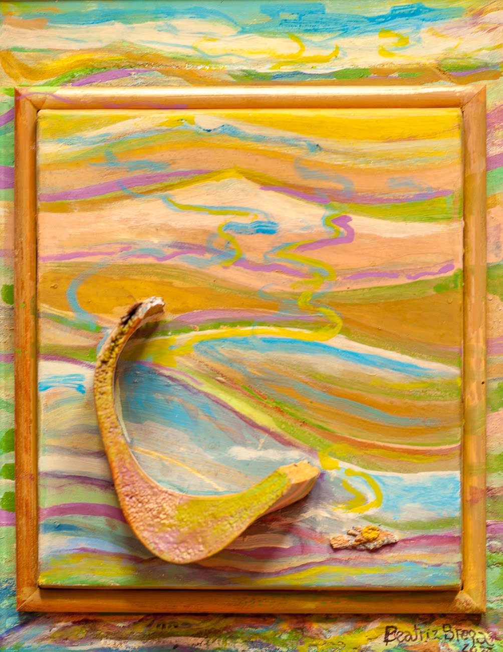 Paisaje abstracto con madero relieve. Colores pasteles, Suavidad y armonía. Composición que continúa la serie de la temática del agua y su desarrollo en la geografía regional.