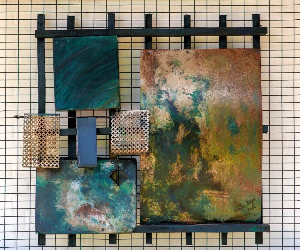 Collage de distintos materiales. Composición abstracta que busca valorizar elementos por medio del uso artístico, confiriendo a los elementos nuevo valor y resignificando su sentido original. El agua está presente en el ambiente verde, es nuestra obligación cuidarlo, para esta, y las generaciones futuras.