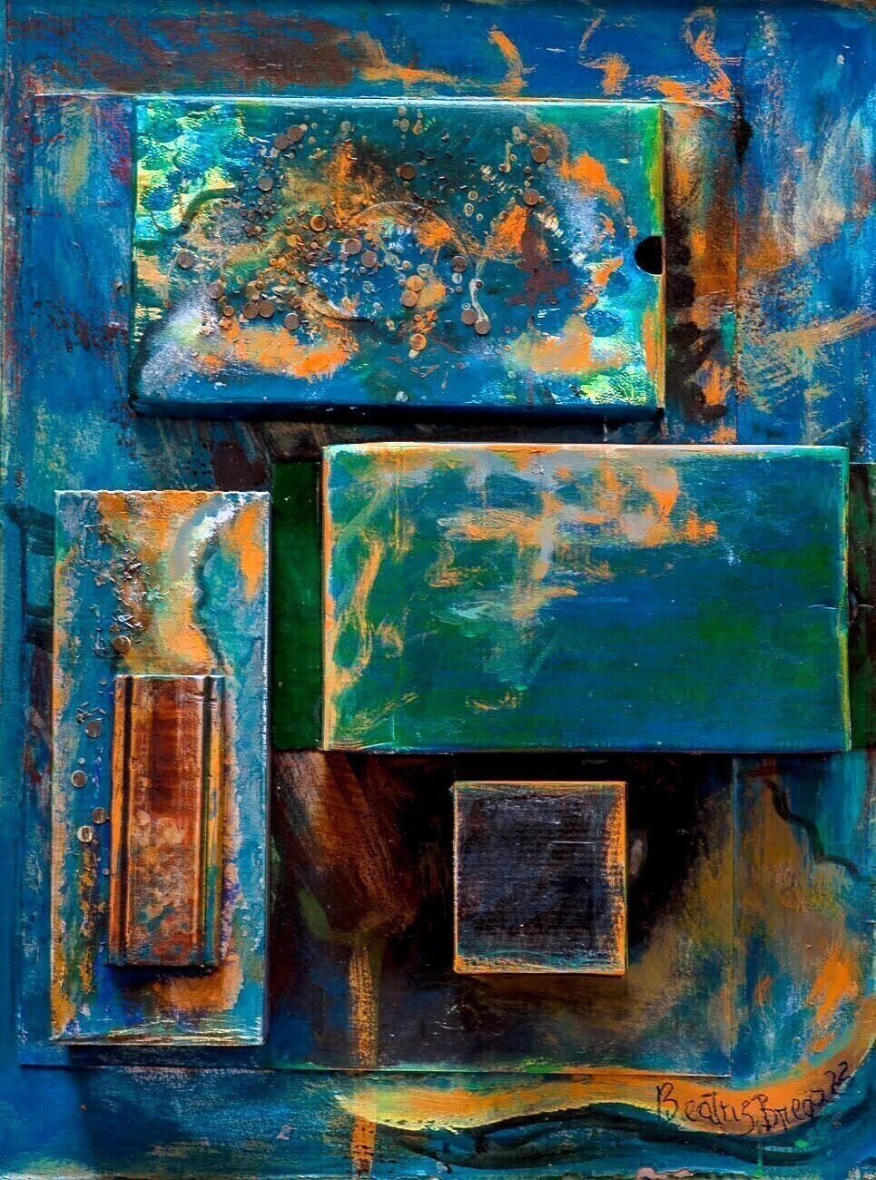 Juego de volúmenes, luces, sombras, Formas cóncavas y convexos por los que puede abrirse una puerta y entrar la luz. Arte para interactuar y aprender composición plástica. Colores fríos, superficies en contrastes de texturas y lisos.