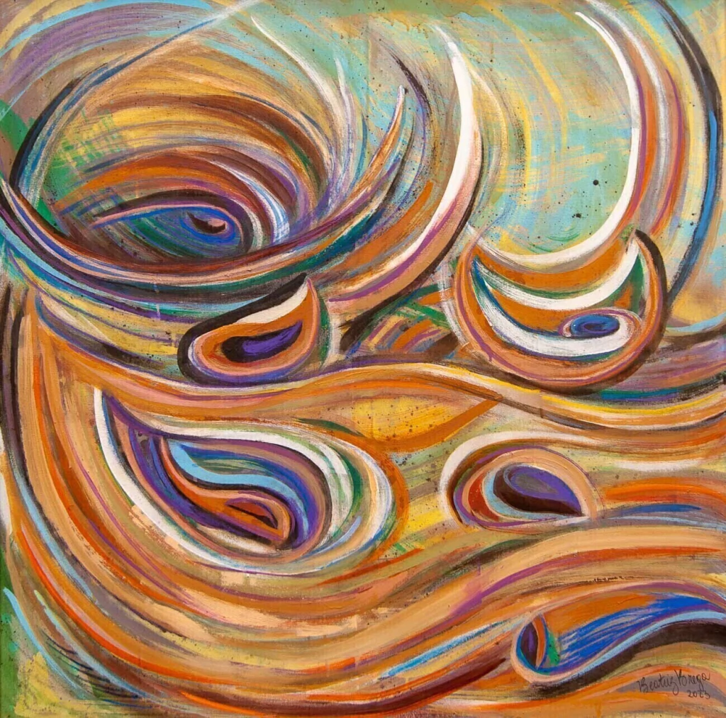 Composición abstracta basada en líneas moduladas sobre fondo liso. Los 4 sectores estructurales se enlazan con conectores y colores rítmicos. El viento norte como realidad presente en nuestra geografía y como oportunidad de despeinarse y concretar sueños. Besos, agua fresca, colores, poesía danzas y canciones. ¡Viva Jujuy!