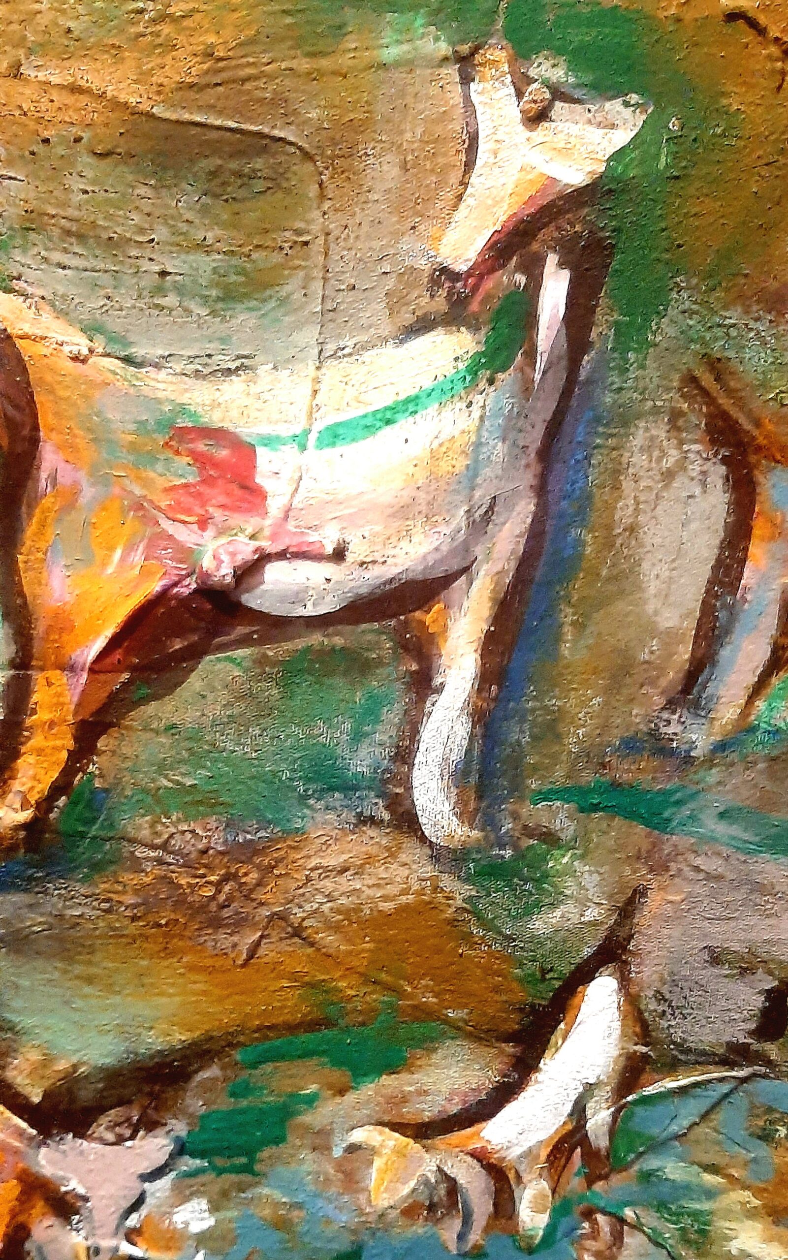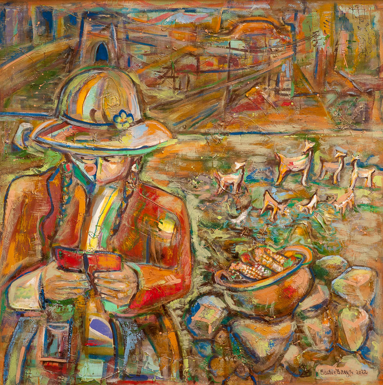 Composición figurativa expresiva de gran tamaño y de profundo respeto por el patrimonio natural y cultural originario de la provincia. Mientras beben agua fresca los animalitos. La pastorcita, concentrada y empoderada con la tecnología. Una realidad, local, también universal. Para muchas mujeres, una oportunidad y posibilidad de expandir su actividad y horizontes. Gracias a quienes posibilitan la conectividad. Técnica de colores, empastes contundentes y diversos. Elaborada composición y calidad expresiva.